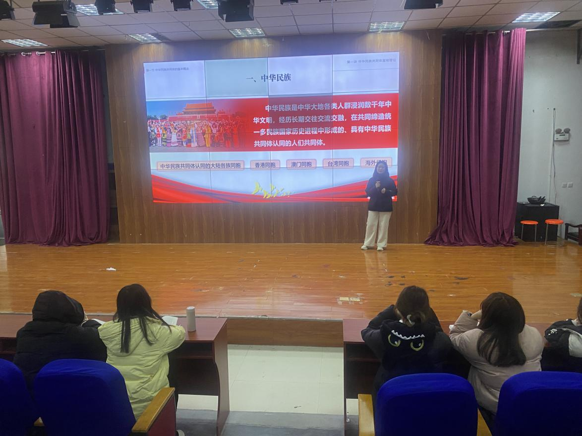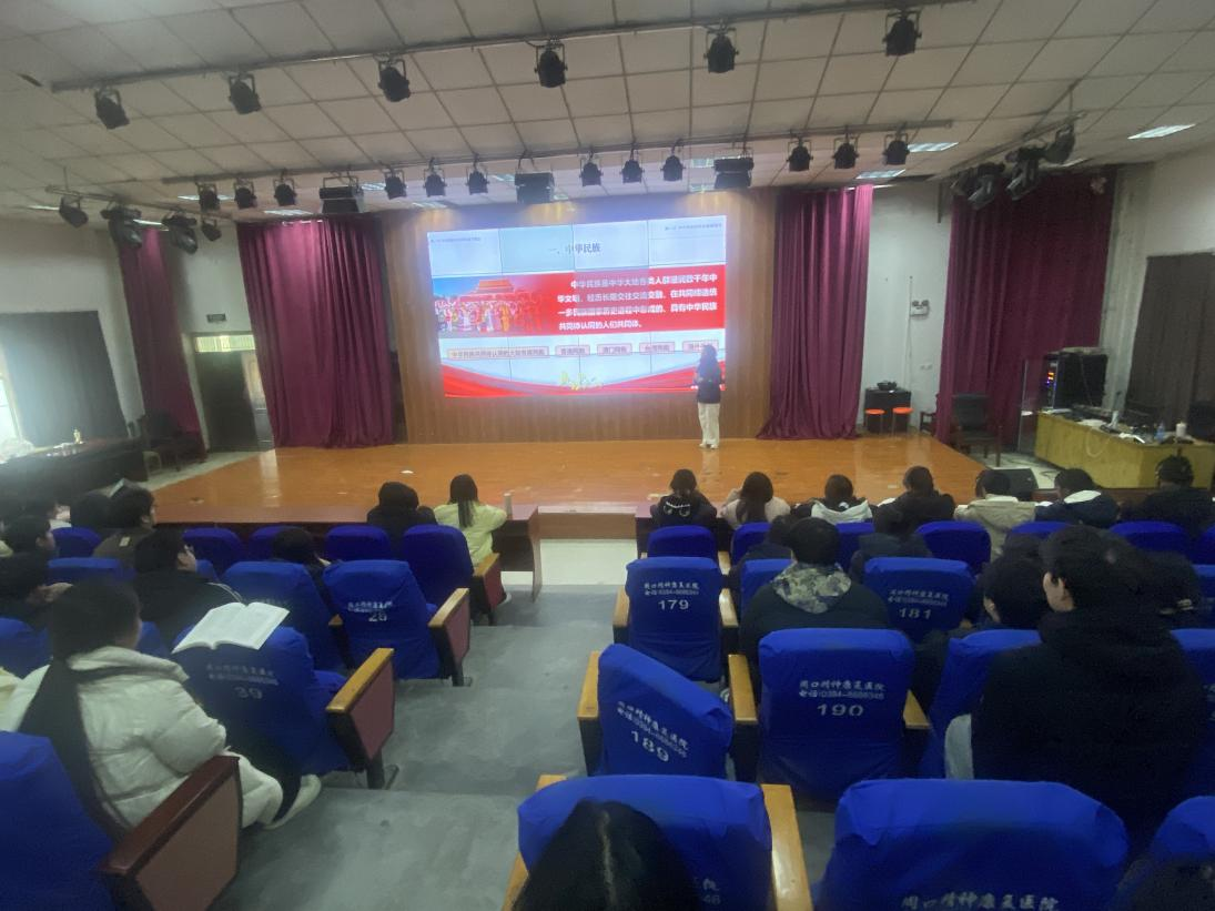 12月24日,张放放老师以“铸牢中华民族共同体意识 凝聚伟大复兴磅礴力量”为主题,在文昌校区报告厅为2024级护理专业学生进行宣讲。